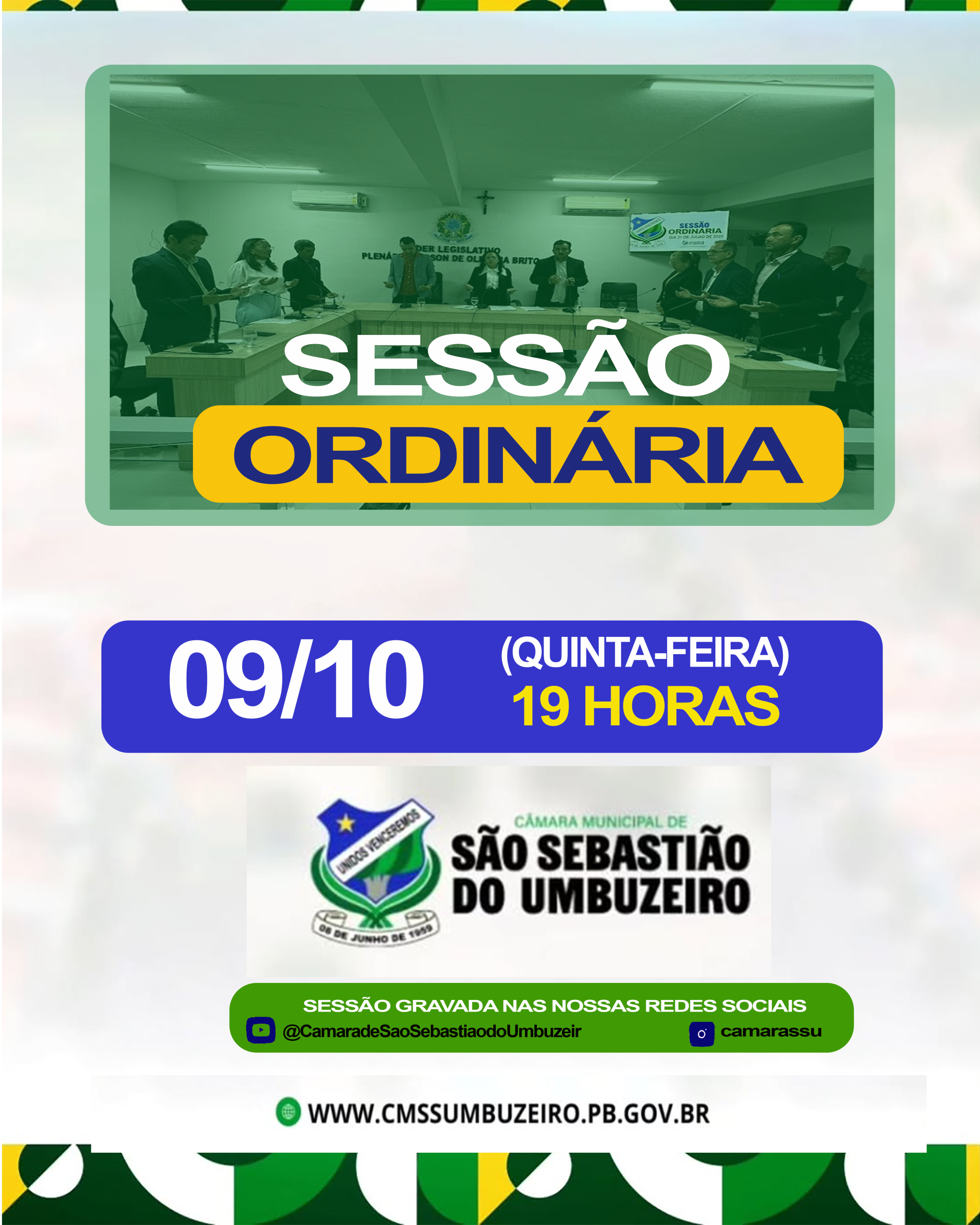 A Câmara Municipal de São Sebastião do Umbuzeiro realizará nesta quinta-feira, dia 09 de outubro, mais uma Sessão Ordinária. Na pauta, estarão em análise e votação três Projetos de Lei, um de Resolução e uma Indicação de autoria do Vereador Agenor Correia de Lima Junior. A sessão será conduzida pela presidente vereadora Sildete Siqueira Bezerra Pires, contando com a presença dos demais vereadores e equipe administrativa. O momento reforça o compromisso do Poder Legislativo com o debate democrático e o fortalecimento das ações que contribuem para o desenvolvimento do município.…