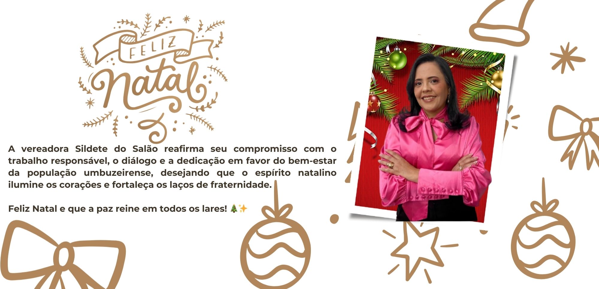 A vereadora Sildete do Salão reafirma seu compromisso com o trabalho responsável, o diálogo e a dedicação em favor do bem-estar da população umbuzeirense, desejando que o espírito natalino ilumine os corações e fortaleça os laços de fraternidade.