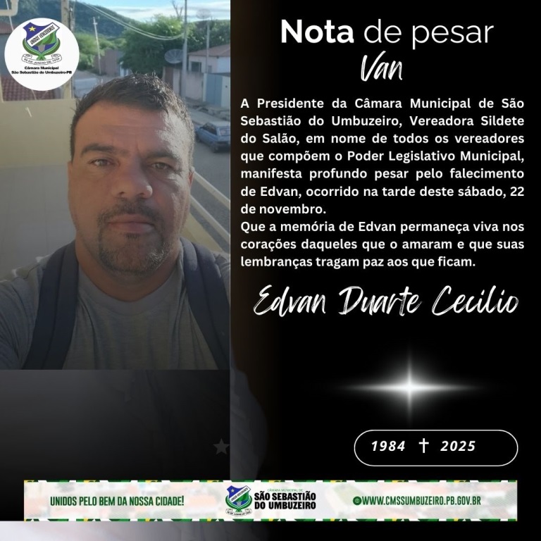 A Presidente da Câmara Municipal de São Sebastião do Umbuzeiro, Vereadora Sildete do Salão, em nome de todos os vereadores que compõem o Poder Legislativo Municipal, manifesta profundo pesar pelo falecimento de Edvan, ocorrido na tarde deste sábado, 22 de novembro. A notícia da morte repentina de Edvan causou grande comoção em toda a comunidade. Figura conhecida e querida no município, Edvan deixava sua marca por meio da amizade sincera, da simplicidade no trato com as pessoas e do respeito que dedicava a todos. Sua partida inesperada representa uma perda…