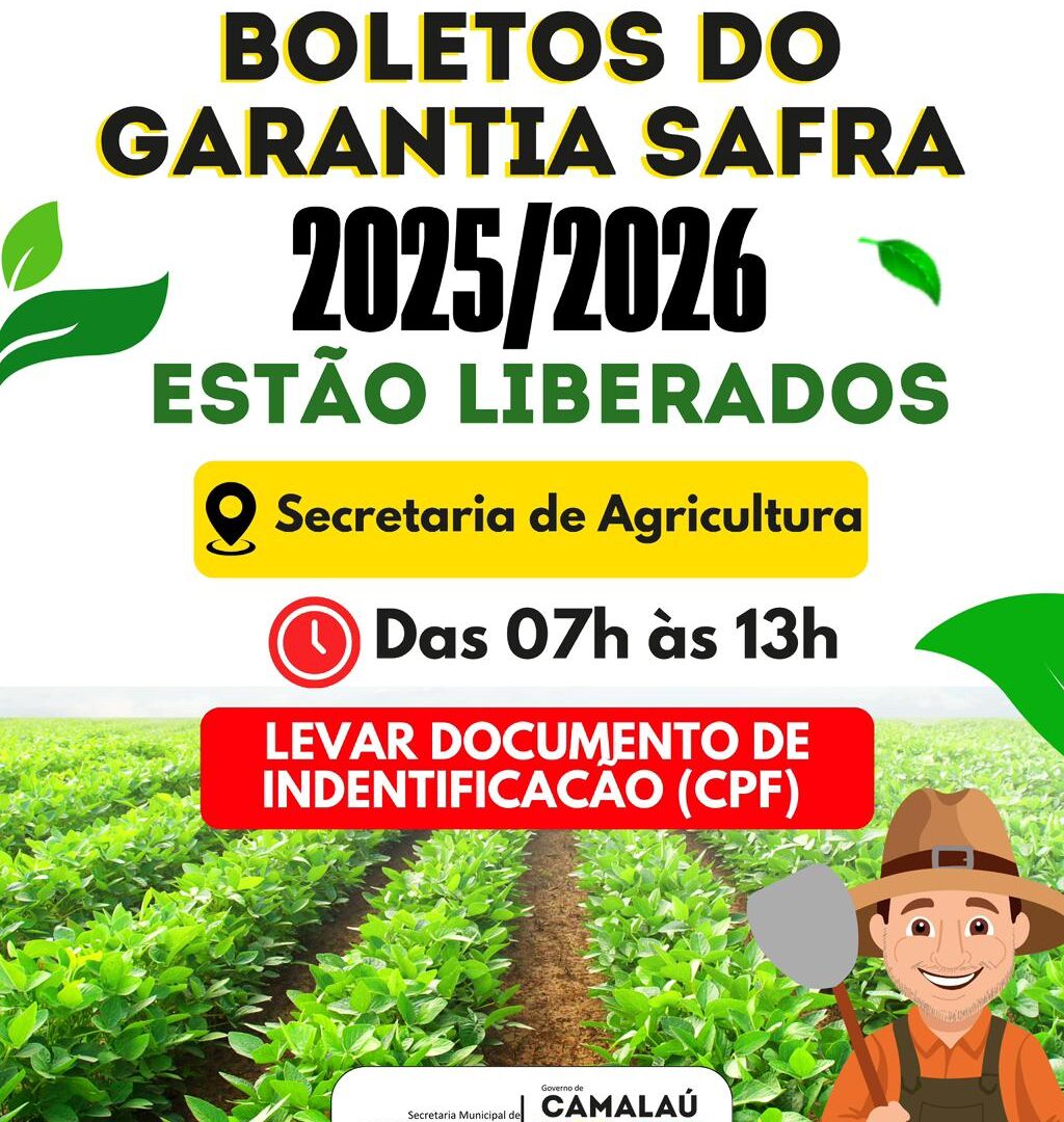 A Prefeitura de Camalaú informa aos agricultores do município que os boletos do Programa Garantia-Safra, referentes à safra 2025/2026, já estão liberados. Os beneficiários devem se dirigir à Secretaria Municipal de Agricultura, no horário das 7h às 13h, para realizar a retirada do boleto. Para o atendimento, é obrigatória a apresentação do CPF ou documento oficial de identificação. A gestão municipal reforça a importância de que os agricultores compareçam dentro do prazo para garantir a regularidade no programa, que assegura apoio financeiro em casos de perdas na produção provocadas por…