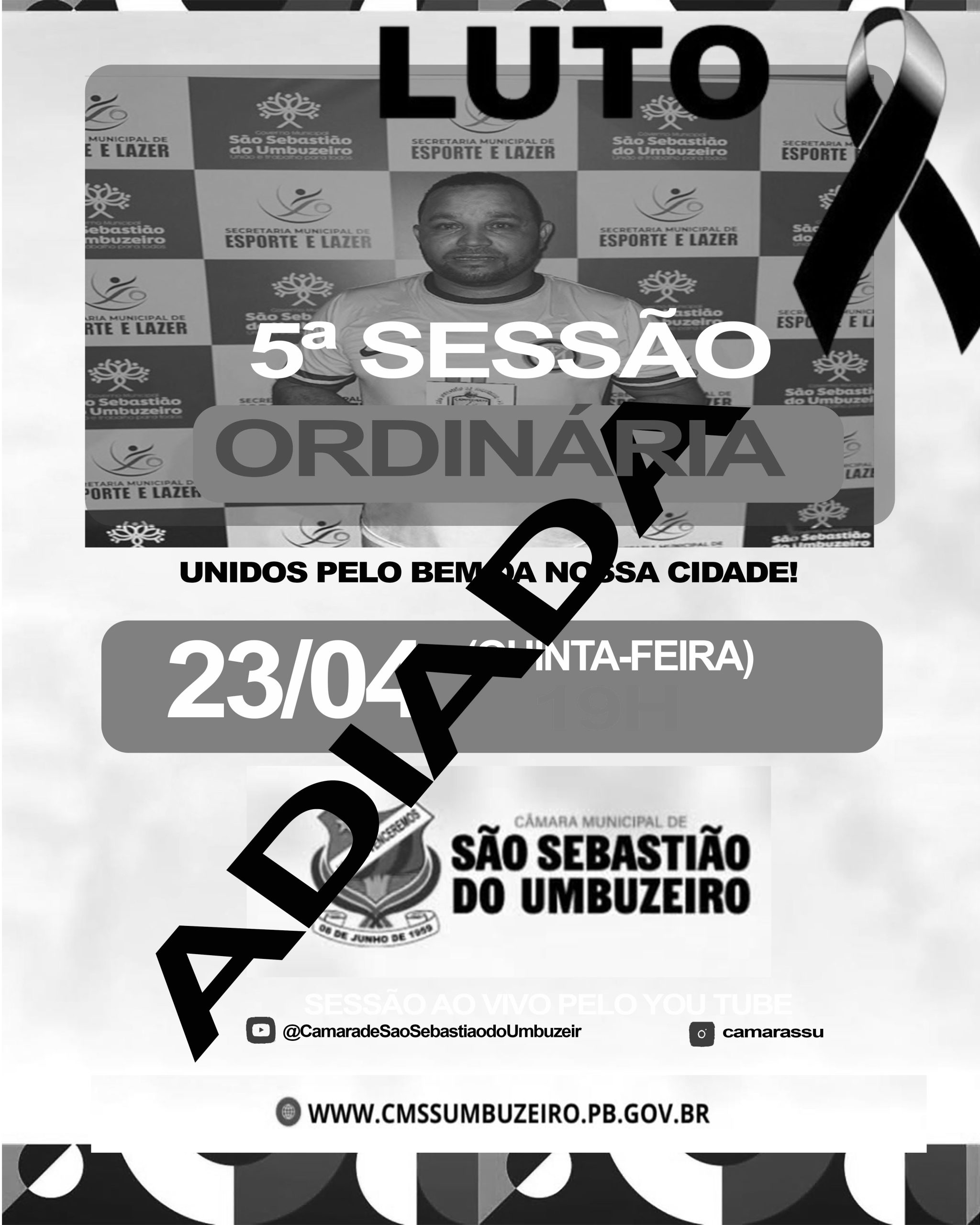 A Câmara Municipal de São Sebastião do Umbuzeiro, por meio da presidente da Casa, a vereadora Sildete do Salão, e dos demais vereadores, decidiu adiar a sessão que seria realizada hoje, em um gesto de respeito e solidariedade aos familiares do Conselheiro Tutelar Vandinho, que faleceu no final da tarde desta quinta-feira, dia 23 de abril.
