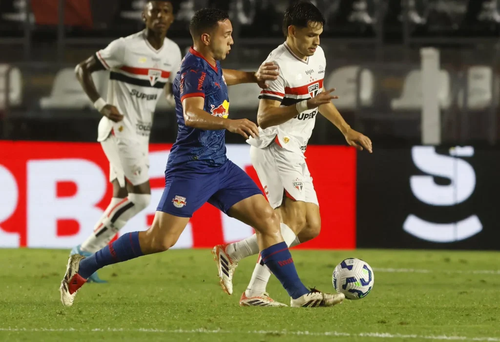 Enzo Díaz: embora seja voluntarioso, o lateral esquerdo cometeu um pênalti que comprometeu o São Paulo, que até então vinha travando um duelo bastante equilibrado com o Red Bull Bragantino. No setor ofensivo, pouco agregou. (Foto: Rubens Chiri/São Paulo FC)