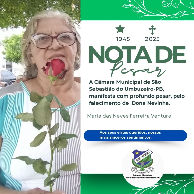 A Presidenta da Câmara Municipal de São Sebastião do Umbuzeiro, vereadora Sildete do Salão, em nome de todos os vereadores e servidores da Casa Legislativa, manifesta profundo pesar pelo falecimento de Dona Nervinha, cidadã muito querida e respeitada em nossa comunidade.