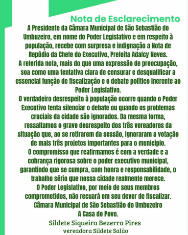 A presidente da Câmara Municipal de São Sebastião do Umbuzeiro, Sildete Salão, divulgou uma nota oficial rebatendo as declarações feitas pela prefeita Adalcy Freitas, que, em posicionamento público, criticou a postura de vereadores durante a última sessão legislativa.