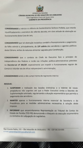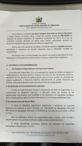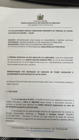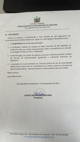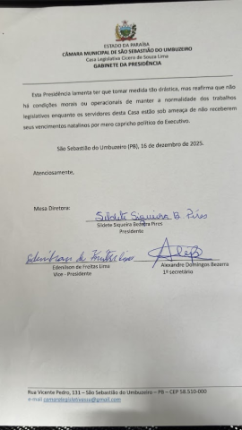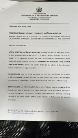 Na noite desta terça-feira, 16, a vereadora Sildete do Salão, Presidente da Câmara Municipal de Vereadores de São Sebastião do Umbuzeiro, decidiu suspender temporariamente os trabalhos legislativos em razão da grave asfixia orçamentária e financeira enfrentada pelo Poder Legislativo, provocada pela ausência dos repasses legais obrigatórios por parte do Poder Executivo Municipal.