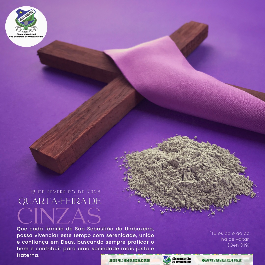 Nesta Quarta-feira de Cinzas, dia 18 de fevereiro de 2026, a Presidente da Câmara Municipal de São Sebastião do Umbuzeiro, vereadora Sildete do Salão, em nome de todos os vereadores, deseja a toda a população um período de Quaresma marcado pela fé, reflexão e renovação espiritual.